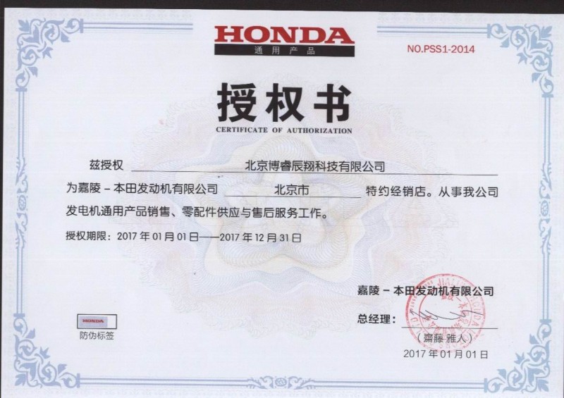 本田代理证书由嘉陵-本田发动机有限公司颁发